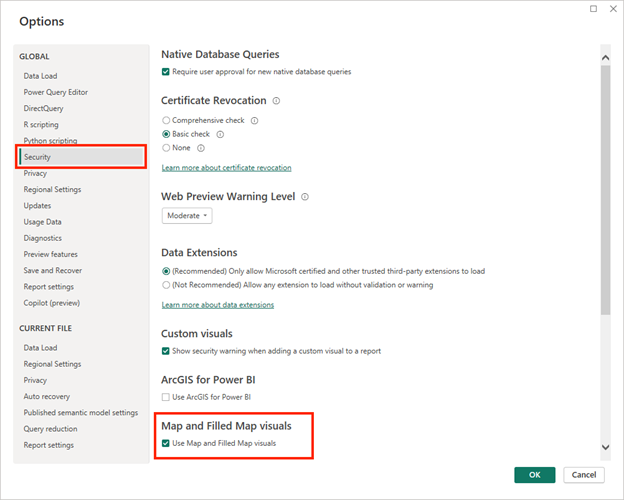 - On the File menu, select Options and Settings. Then select Options, and in the Security section, ensure that Use Map and Filled Map visuals is enabled and select OK.