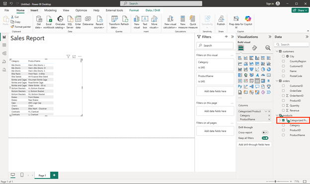 Tip: A category→product hierarchy enables drill-down in visuals, so viewers can explore from summary to detail.
