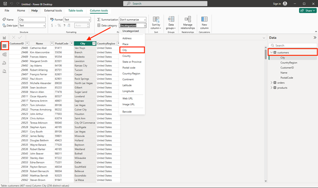 - Select the City column header, and then set its Data Category property to City: