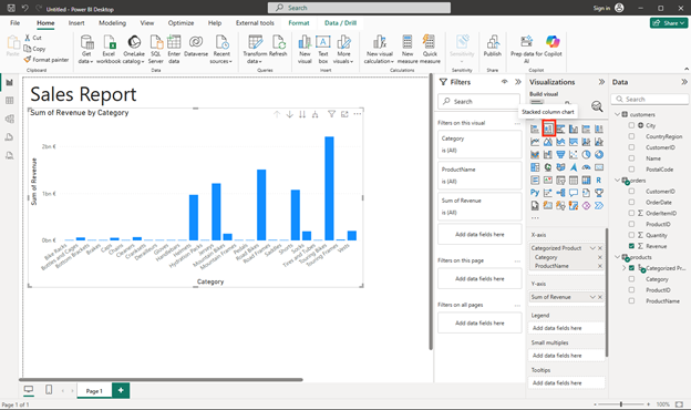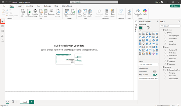 Tip: Bringing in Customers, Products, and Orders creates a small, realistic model. Multiple related tables let you analyze across entities (for example, revenue by product category and city).