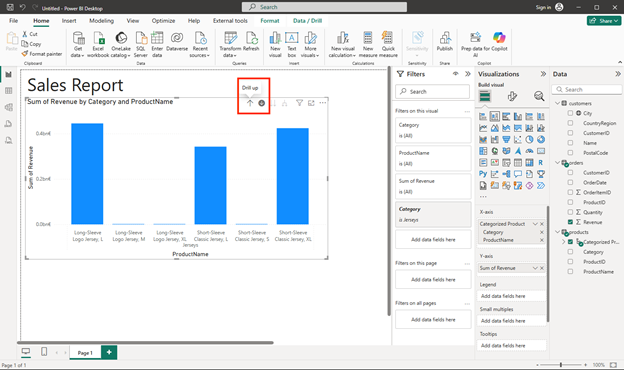- Above the selected column chart, select the ↓ icon to turn on drill-down. Then in the chart, select any column to drill down and see the revenue for the individual products in this category. This capability is possible because you defined a hierarchy of categories and products.