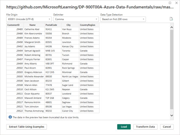 - Verify that the URL opens a dataset containing customer data, as shown below. Then select Load to load the data into the data model for your report.