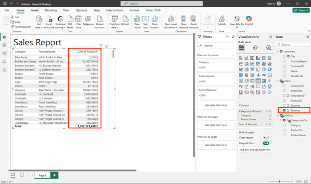 - With the table still selected, in the Data pane, expand Orders and select Revenue. A Revenue column is added to the table. You may need to expand the size of the table to see it.
