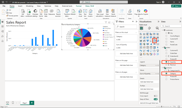 - Select a blank area of the report, and then in the Data pane, select the Quantity field in the orders table and the Category field in the products table. This step results in another column chart showing sales quantity by product category.