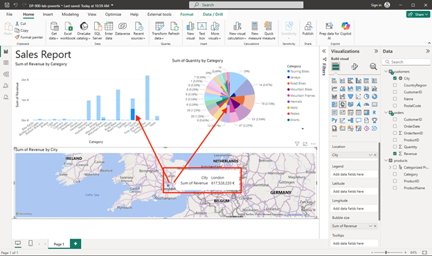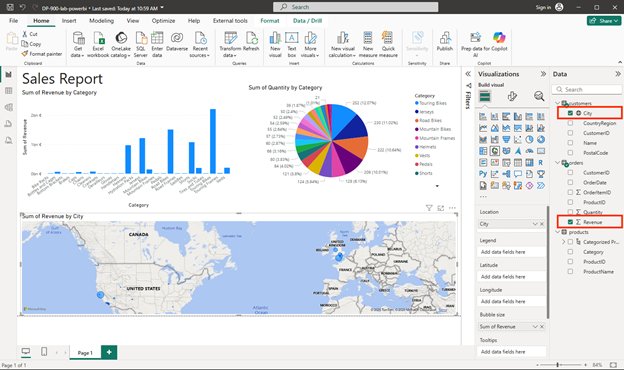 - Select a blank area of the report, and then in the Data pane, select the City field in the customers table and then select the Revenue field in the orders table. This results in a map showing sales revenue by city. Rearrange and resize the visualizations as needed: