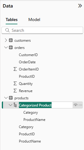 - In the Fields pane, right-click Category Hierarchy (or open its … menu) and select Rename. Then rename the hierarchy to Categorized Product.