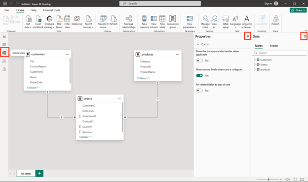 - In Power BI Desktop, on the left-side edge, select the Model tab, and then arrange the tables in the model so you can see them. You can hide the panes on the right side by using the >> icons: