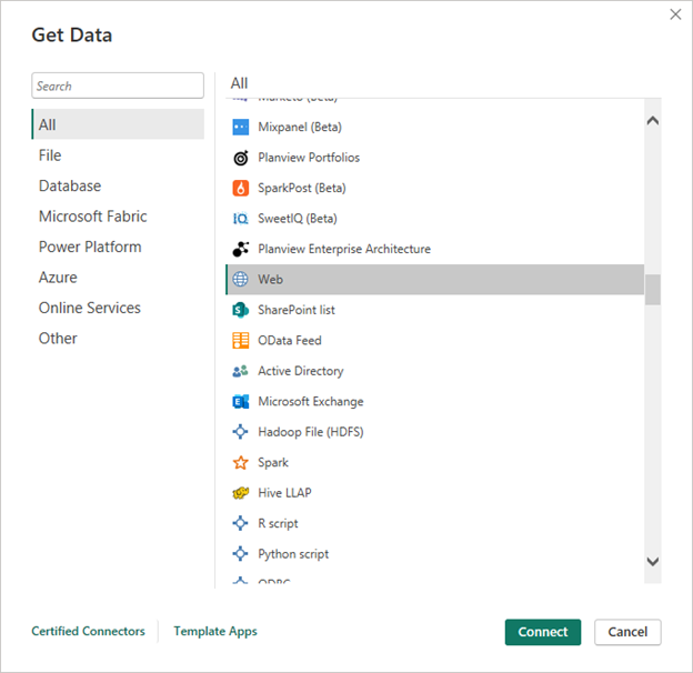 - On the Power BI Desktop welcome screen, select Get data from other sources, and then in the list of data sources, select Web and then select Connect.