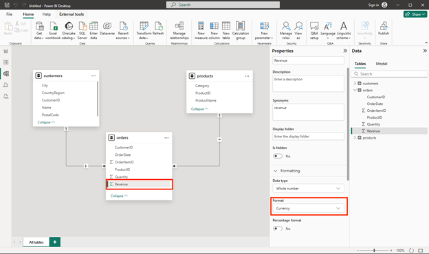 - In the orders table, select the Revenue field and then in the Properties pane, set its Format property to Currency: