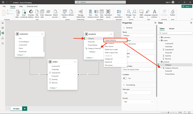 - In the products table, right-click the Category field (or open its ⋮ menu) and select Create hierarchy. This step creates a hierarchy named Category Hierarchy. You may need to expand or scroll in the products table to see this – you can also see it in the Fields pane: