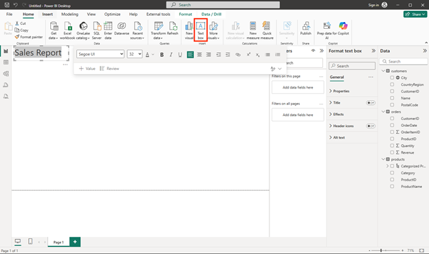 - In the ribbon, above the report design surface, select Text Box and add a text box containing the text Sales Report to the report. Format the text to make it bold with a font size of 32.