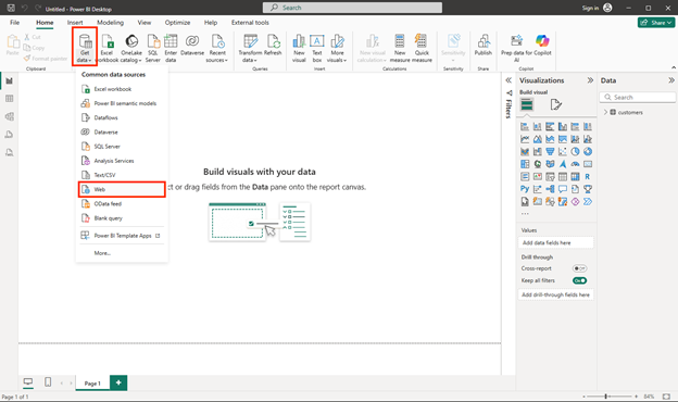 - In the main Power BI Desktop window, in the Data menu, select Get data, then select Web: