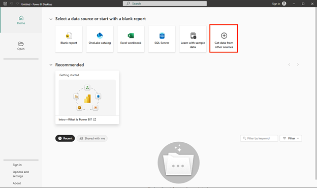 - Open Power BI Desktop. The application interface should look similar to this: